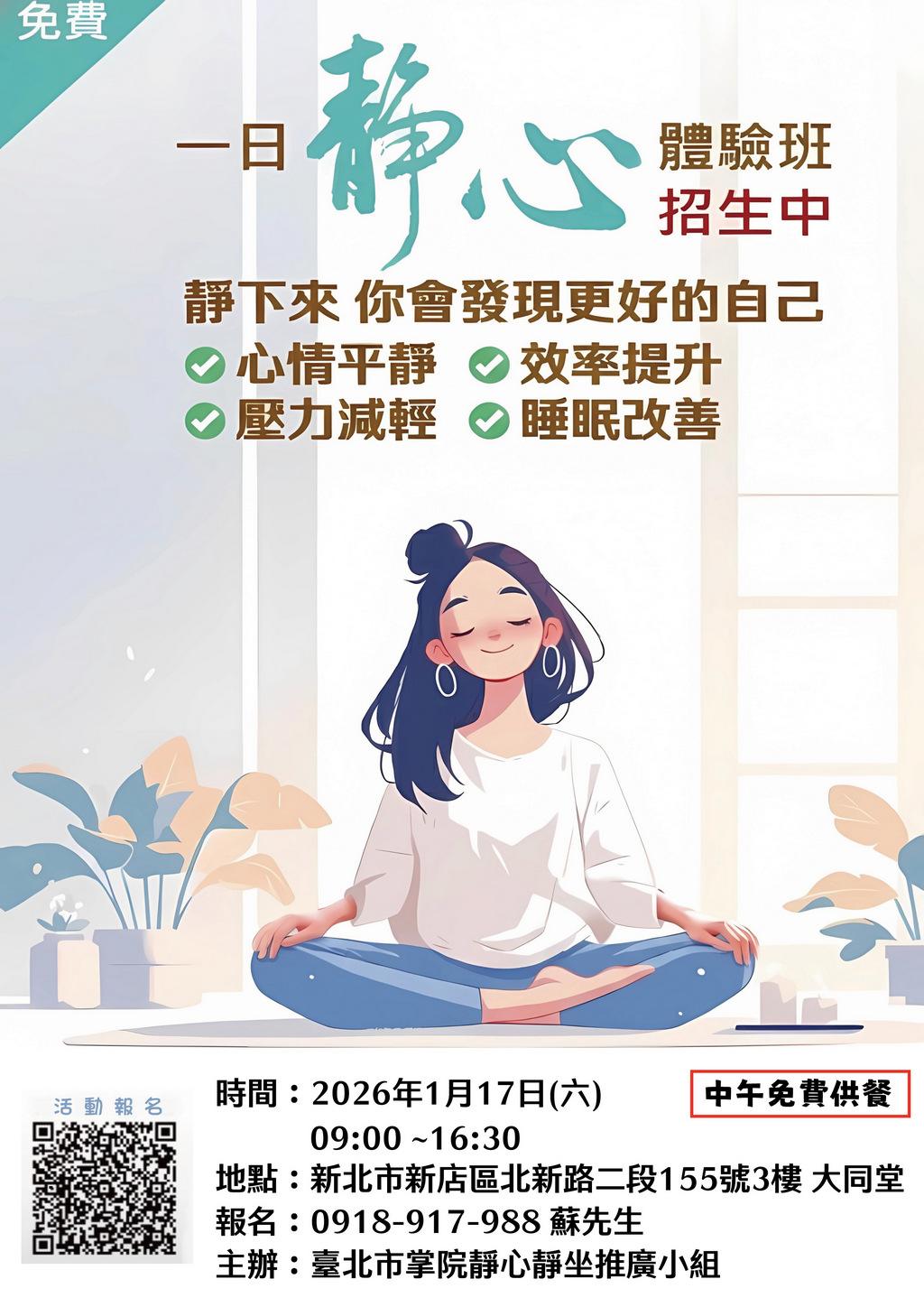 一日靜心體驗+炁功調整自己身、心、靈。歡迎介紹你的親朋好友參加,改變他們未來的生活。