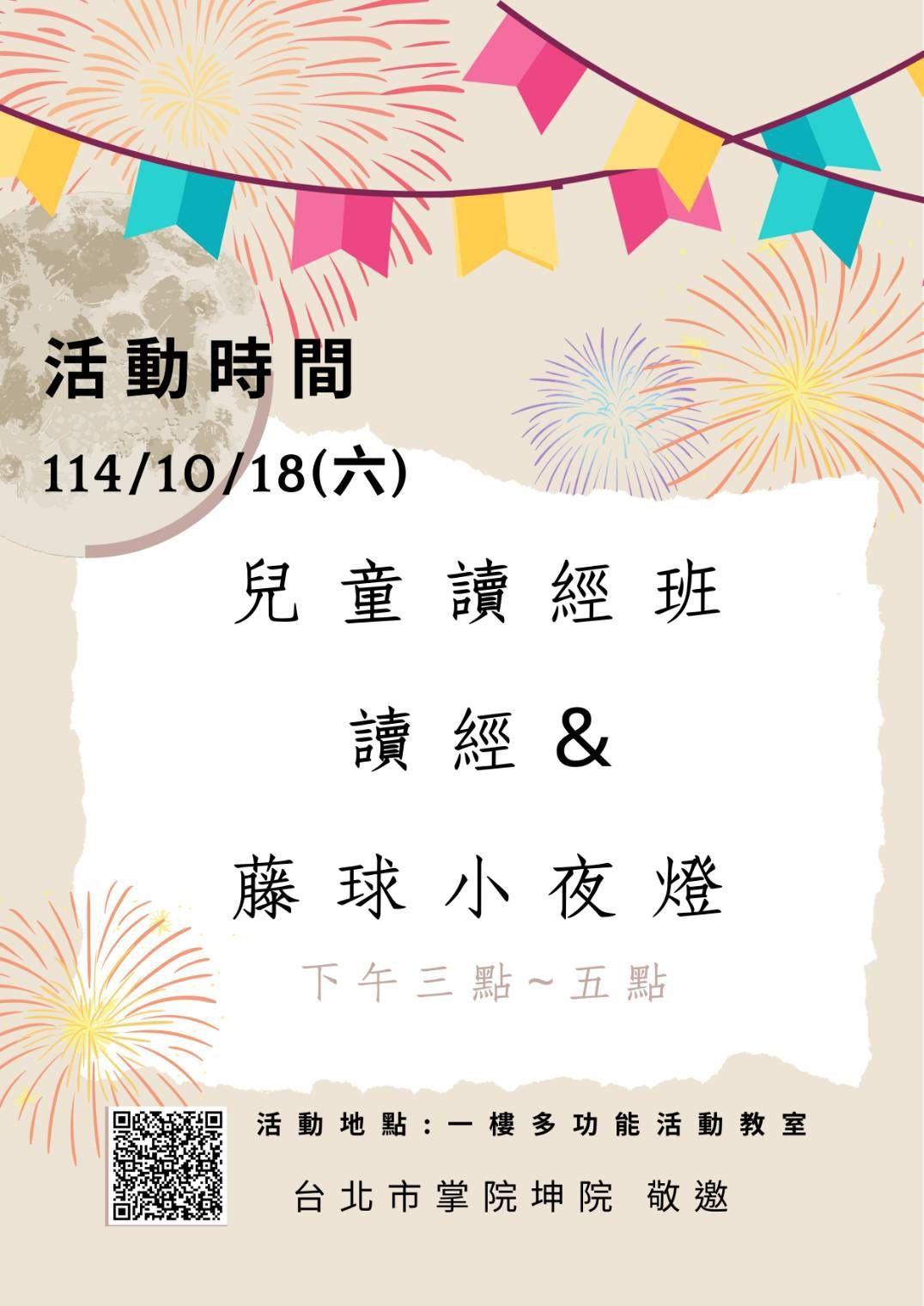 [坤院活動][親和集會.活動.課程] 兒童讀經班 讀經&藤球小夜燈 114.10.18(六) 下午三點~五點 ,台北市掌院一樓(多功能教室) 由 tienti55 2025 年 10 月 4 日 作者 tienti55 2025 年 10 月 4 日 209 台北市掌院兒童讀經班 讀經&藤球小夜燈114.10.18(六) 下午三點~五點地址: 台北市掌院一樓(多功能教室) 報名請點如下連結 https://docs.google.com/forms/d/e/1FAIpQLSe21xPemqe8IrwX9cDW6XXwqtqg1Cx6LDwrEMXyQiWVTBJwCg/viewform?usp=header 台北市掌院坤院 敬邀 雪諄 上一頁 190期靜心靜坐暨奮鬥初乘班開班-114.10.11(六)起七周,每周六 8:30-10:30 新文章 第二屆天帝教生死學研討會, 114年10月26日(日), 天安太和道場, 報名截止日期:114.10.20(一)