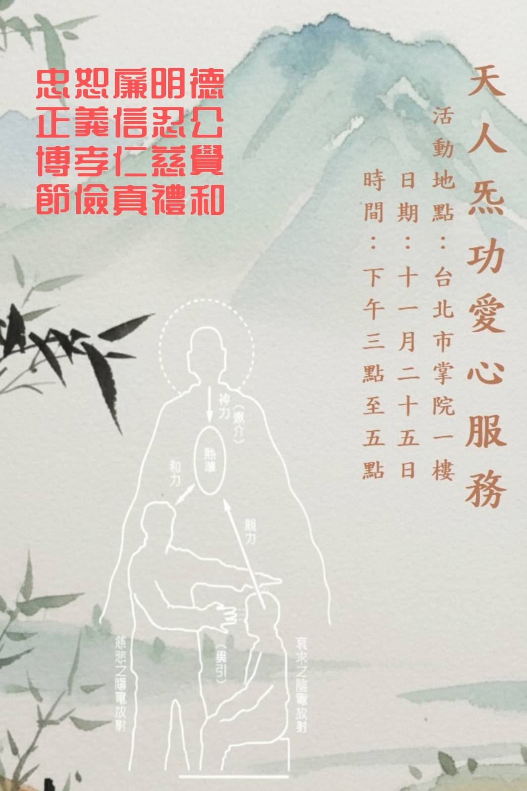 [炁功活動] 天人炁功愛心服務-114.11.25(二) PM 3-5點,地點:台北市掌院一樓 由 tienti55 2025 年 11 月 22 日 作者 tienti55 2025 年 11 月 22 日 14 天人炁功愛心服務-114.11.25(二) PM 3-5點,地點:台北市掌院一樓道歷 上一頁 親和集會-輪迴轉世之迷,主講人:緒含, 日期:114.11.22(六) 15:10, 地點:台北市掌院 新文章 恭賀何光傑樞機使者榮膺天帝教第五任首席使者!!!