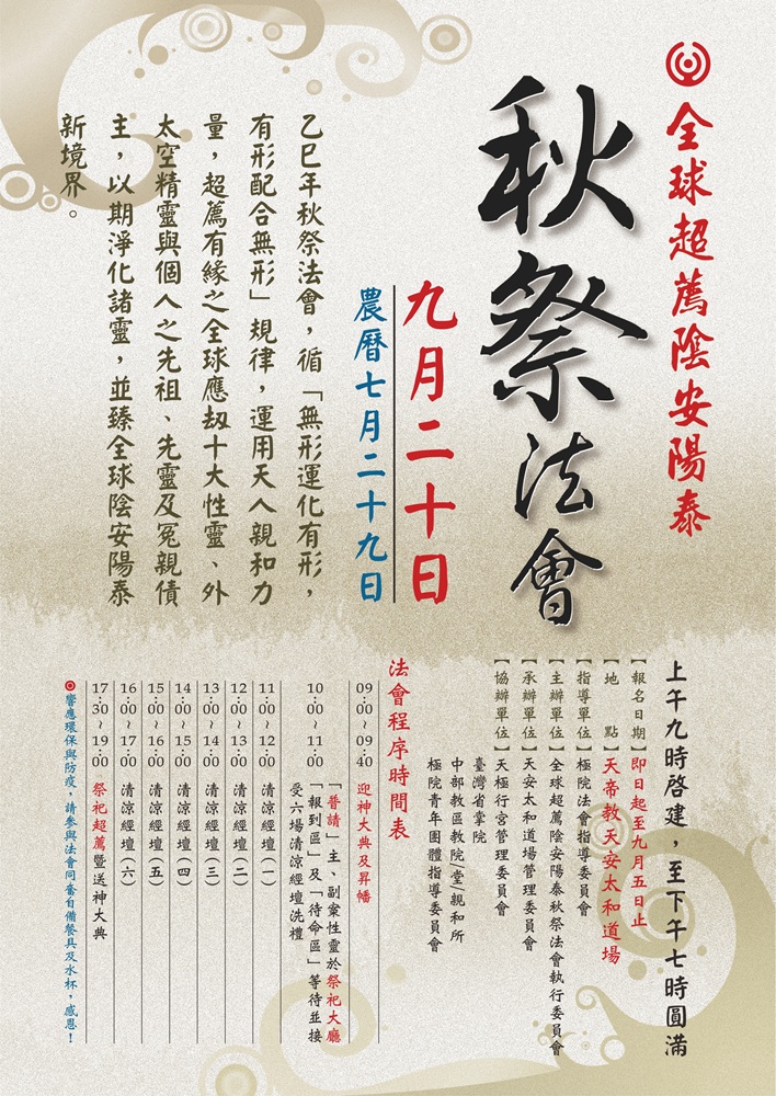 [法會.巡天節] 天帝教-114秋祭法會-114.9.20 (報名至9/5止) 由 tienti55 2025 年 8 月 7 日 作者 tienti55 2025 年 8 月 7 日 408 天帝教-114秋祭法會-114.9.20 (報名至9/5止) 上一頁 114/8月份 掌院活動一覽 (點圖可放大) 新文章 破劫-覺世興仁-向自己奮鬥加強誦誥運動,自114年7月1日至116年2月28日(丙午年巡天劫)結束