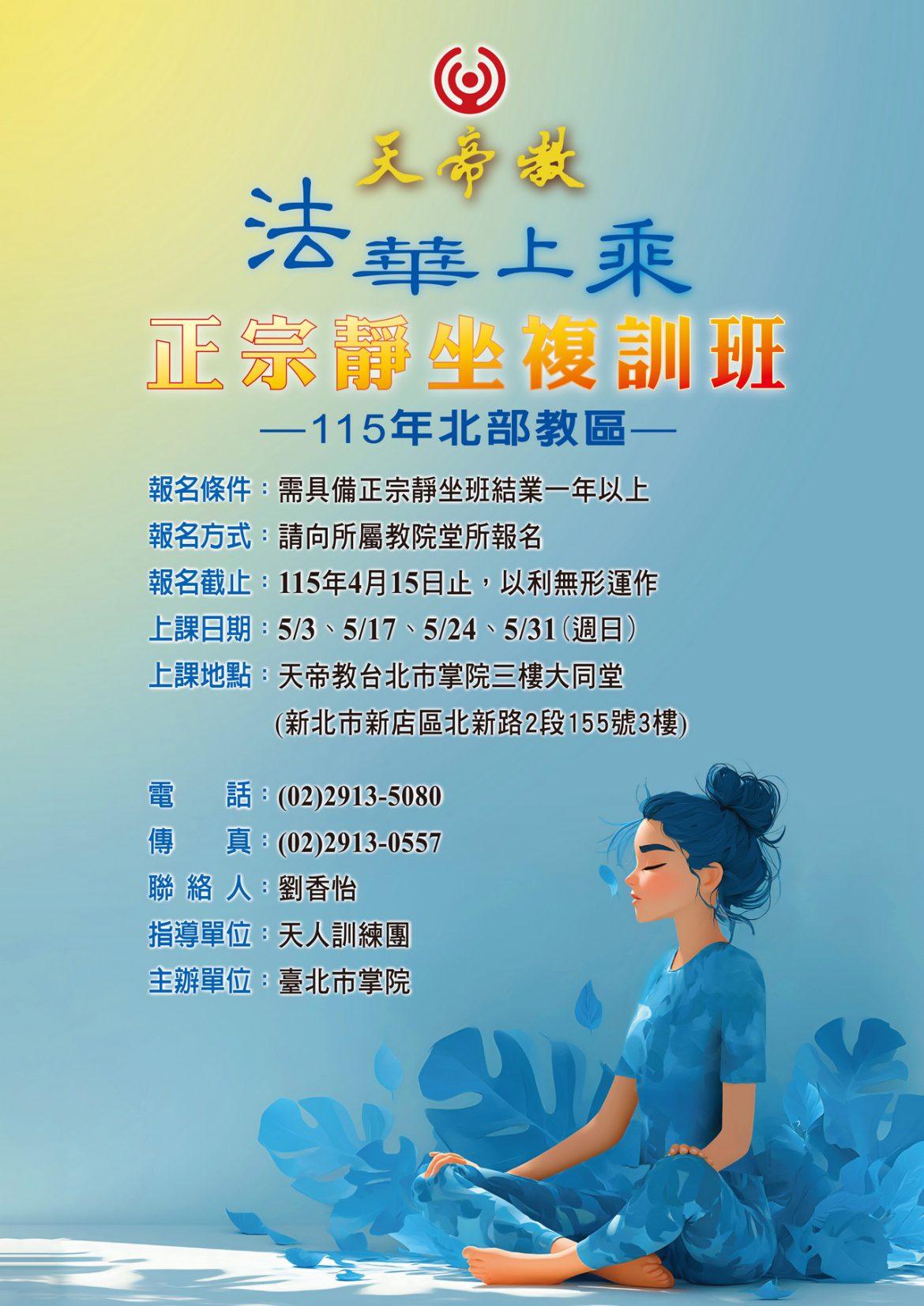 [靜坐班開班資訊] 法華上乘-正宗靜坐複訓班招生-報名截止日期:115.4.15止 由 tienti55 2026 年 4 月 15 日 作者 tienti55 2026 年 4 月 15 日 5 法華上乘-正宗靜坐複訓班招生-報名截止日期:115.4.15止 上一頁 台北市掌院|四月份親和集會-巡天節聖訓解析(下)- 2026.4.25(六) 15:15-17:00 講師:緒氣掌教台北市掌院|四月份親和集會- 新文章 天人炁功服務-115.4.15(三) 15:00-17:00