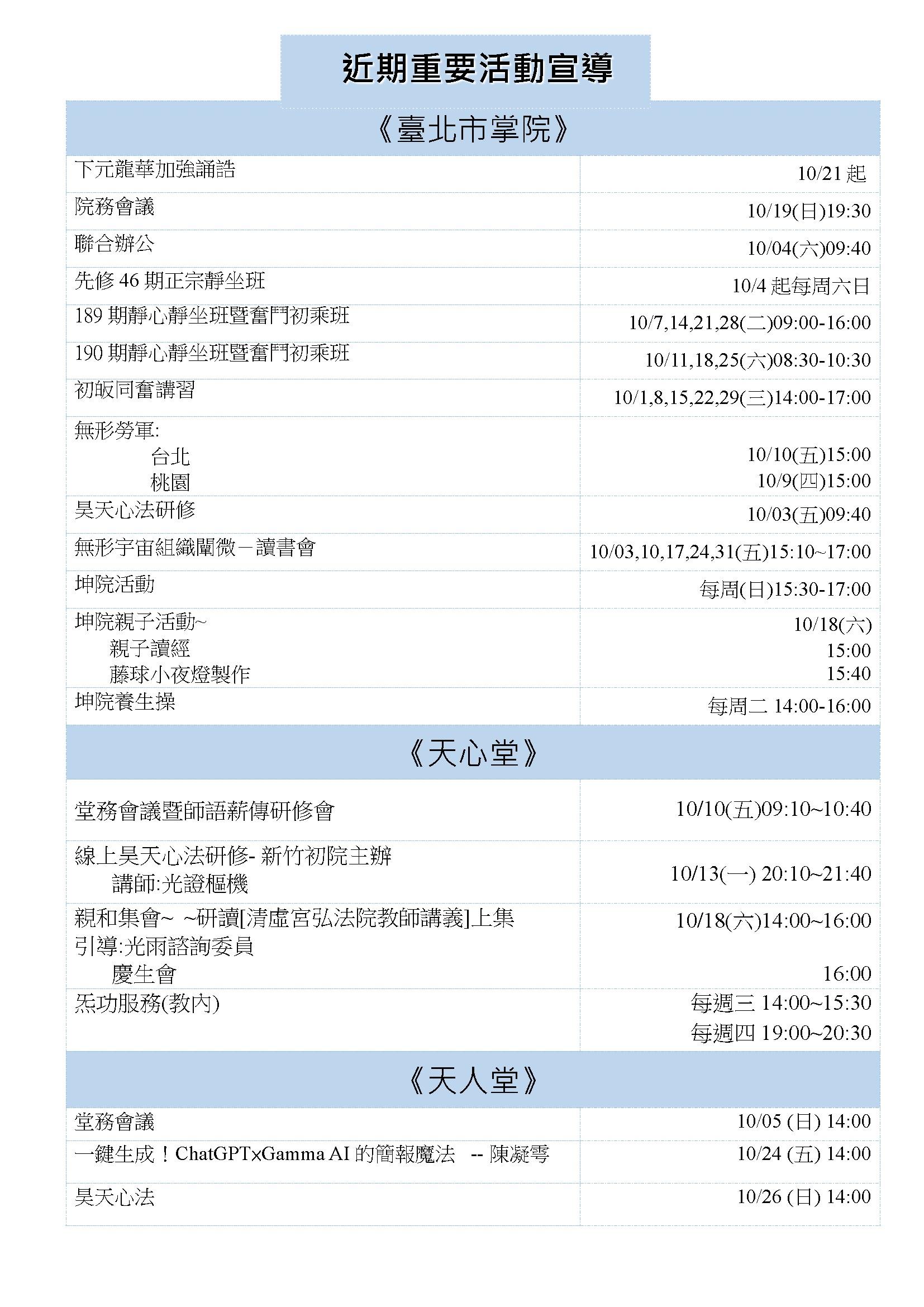 [親和集會.活動.課程] 114/10月重要活動宣導 由 tienti55 2025 年 10 月 1 日 作者 tienti55 2025 年 10 月 1 日 254 114/10月重要活動宣導 上一頁 114.10.3(五)昊天心法上課研修-緒氣掌教 新文章 190期靜心靜坐暨奮鬥初乘班開班-114.10.11(六)起七周,每周六 8:30-10:30