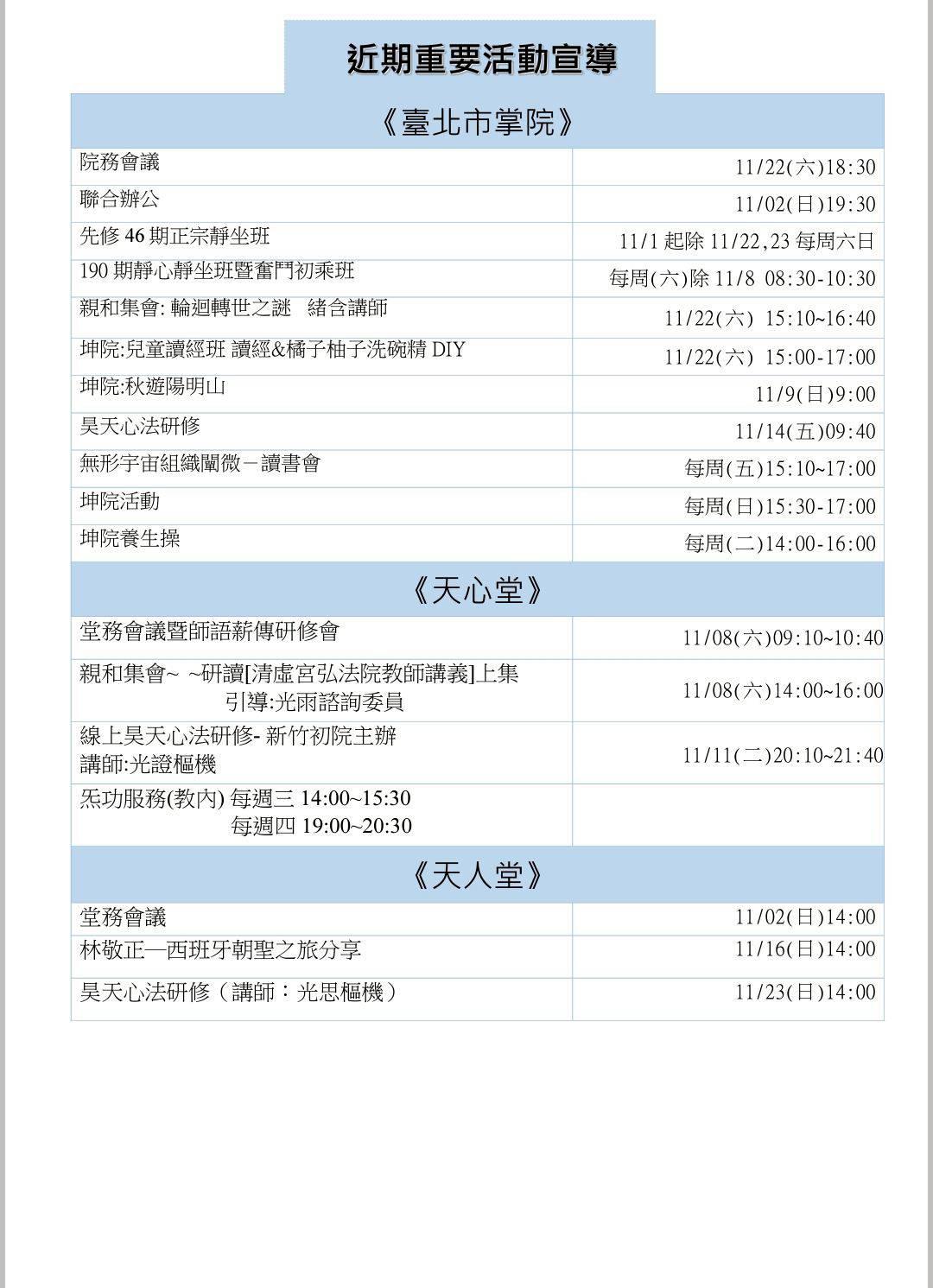 [親和集會.活動.課程] 114/11月重要活動宣導 由 tienti55 2025 年 11 月 1 日 作者 tienti55 2025 年 11 月 1 日 164 114/11月重要活動宣導 上一頁 秋遊陽明山-日期:11月9日(日),同歡親和、共遊山林 新文章 親和集會-輪迴轉世之迷,主講人:緒含, 日期:114.11.22(六) 15:10, 地點:台北市掌院