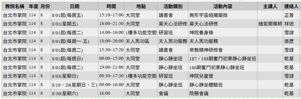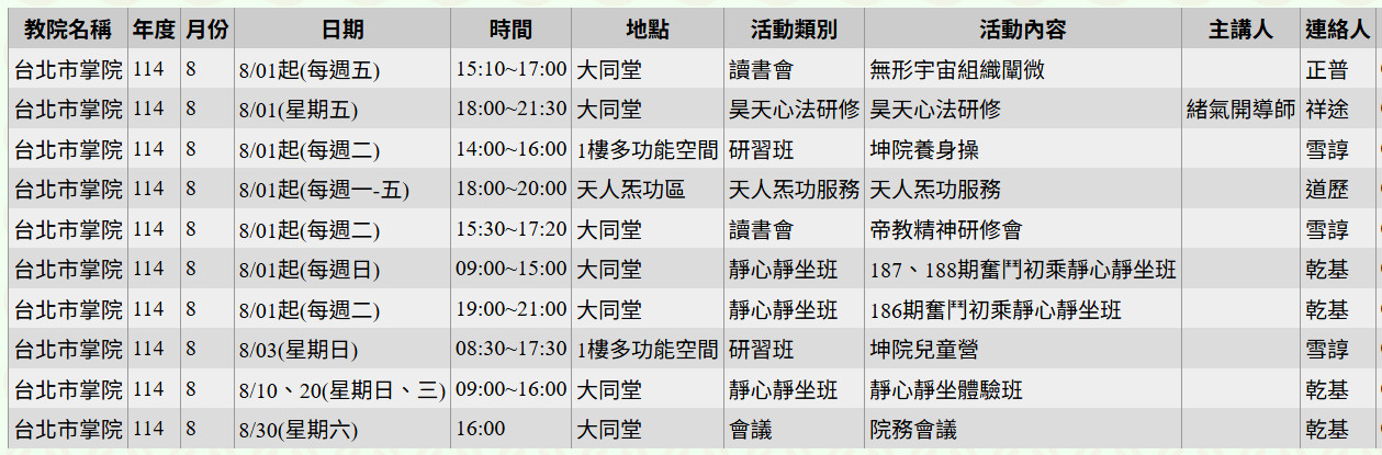 [親和集會.活動.課程] 114/8月份 掌院活動一覽 (點圖可放大) 由 tienti55 2025 年 8 月 6 日 作者 tienti55 2025 年 8 月 6 日 425 114/8月份 掌院活動一覽 (點圖可放大) 上一頁 一日靜心靜坐體驗班招生中-114.8.10 , 114.8.20 新文章 天帝教-114秋祭法會-114.9.20 (報名至9/5止)
