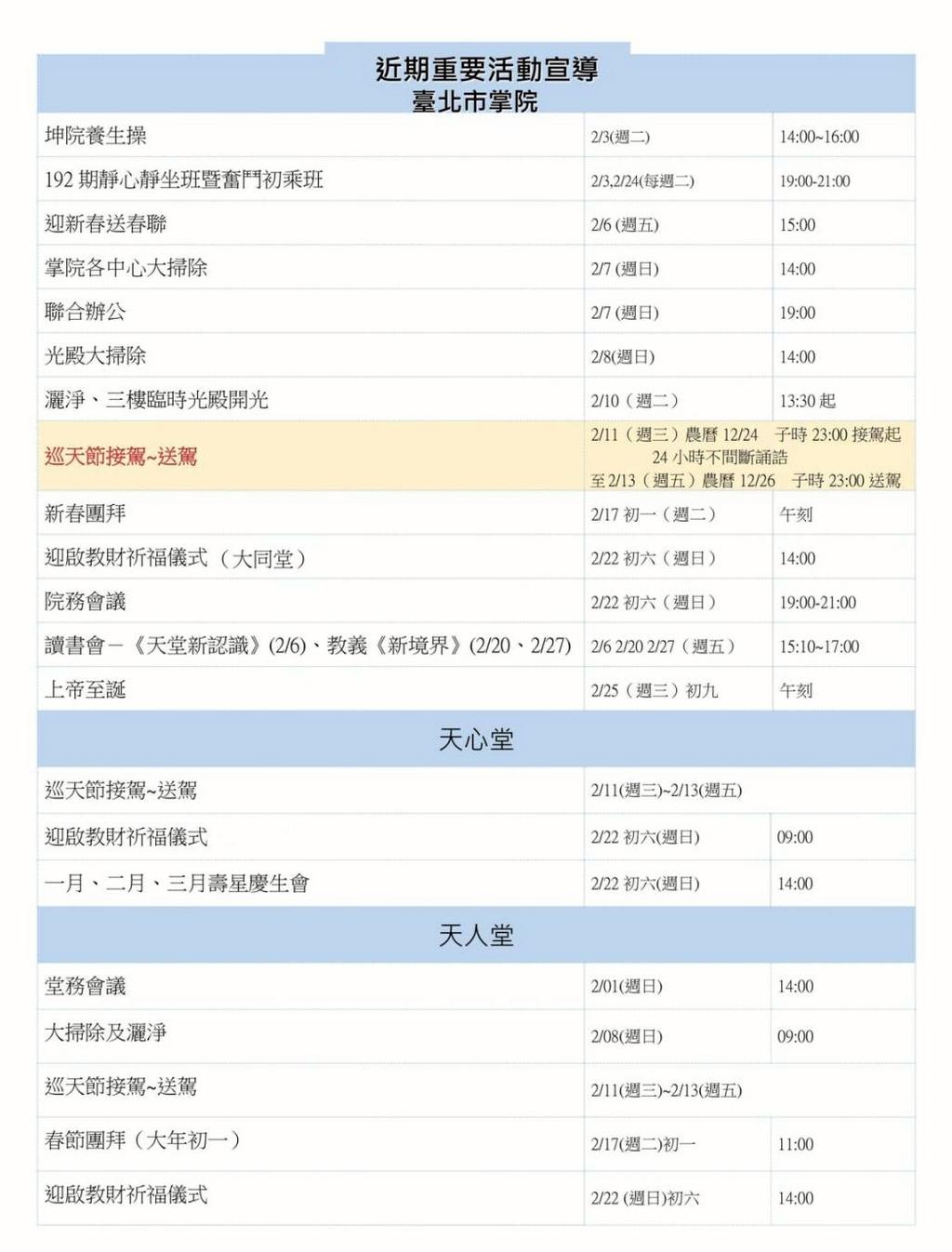 [親和集會.活動.課程] 115/2月重要活動宣導 由 tienti55 2026 年 2 月 1 日 作者 tienti55 2026 年 2 月 1 日 292 上一頁 一日靜心體驗+炁功調整自己身、心、靈。歡迎介紹親朋好友參加,改變他們未來的生活-115.1.17(六) 09:00-16:30 新文章 2026 乙巳年巡天節 -2/4(三) 23:00後開始茹素; 2/11(三)23:00接駕; 2/13(五)23:00送駕